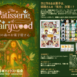 - 日本ツイクスト協会【土曜-T30】は、2026年5月23日(土)に開催される「ゲームマーケット2026春」にて、新作ボードゲーム『The Pâtisserie of Fairywood -妖精の森のお菓子屋さん-』を頒布いたします。本作は、パステルカラーの愛らしいアートワークと「お菓子作り」という親しみやすいテーマを掲げながら、その本質はワーカープレイスメントにトリックテイキングの鋭い戦略性を融合させた本格派ゲームとなっています。詳しくは商品ページをご覧ください!!