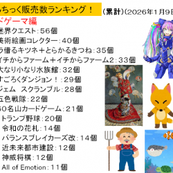 - 【あんちっく販売数ランキング】2025年度発表~!1位:けろりんむらの田植え:154個2位:ぼけなしかるた(非売品):60個3位:けろりんむら:53個たね企画室作品が上位独占!\(^0^)/久々に販売数も100個超に伸びて あんちっく復活の兆しか…!!?非売品のランクインが多かったのも今年の特徴です♪d(^^)続いて累計販売数なんですが…毎年同じような感じになるのですが、今年は上位で順位の変動が起きてます♪\(^^)(ちなみに去年の販売数ランキングはこちら!)特筆すべきは初年度でいきなり『けろりんむらの田植え』が12位にライクインしています♪d(^0^)なお、新作が多かった2024年度に比べると2025年度は上手く新作が増やせなかったんですよね…『けろりんむらの田植え』のみとも\(^^;)2026年度こそは新作をラッシュする予定なので超ご期待あれ!!\(^ワ^)/