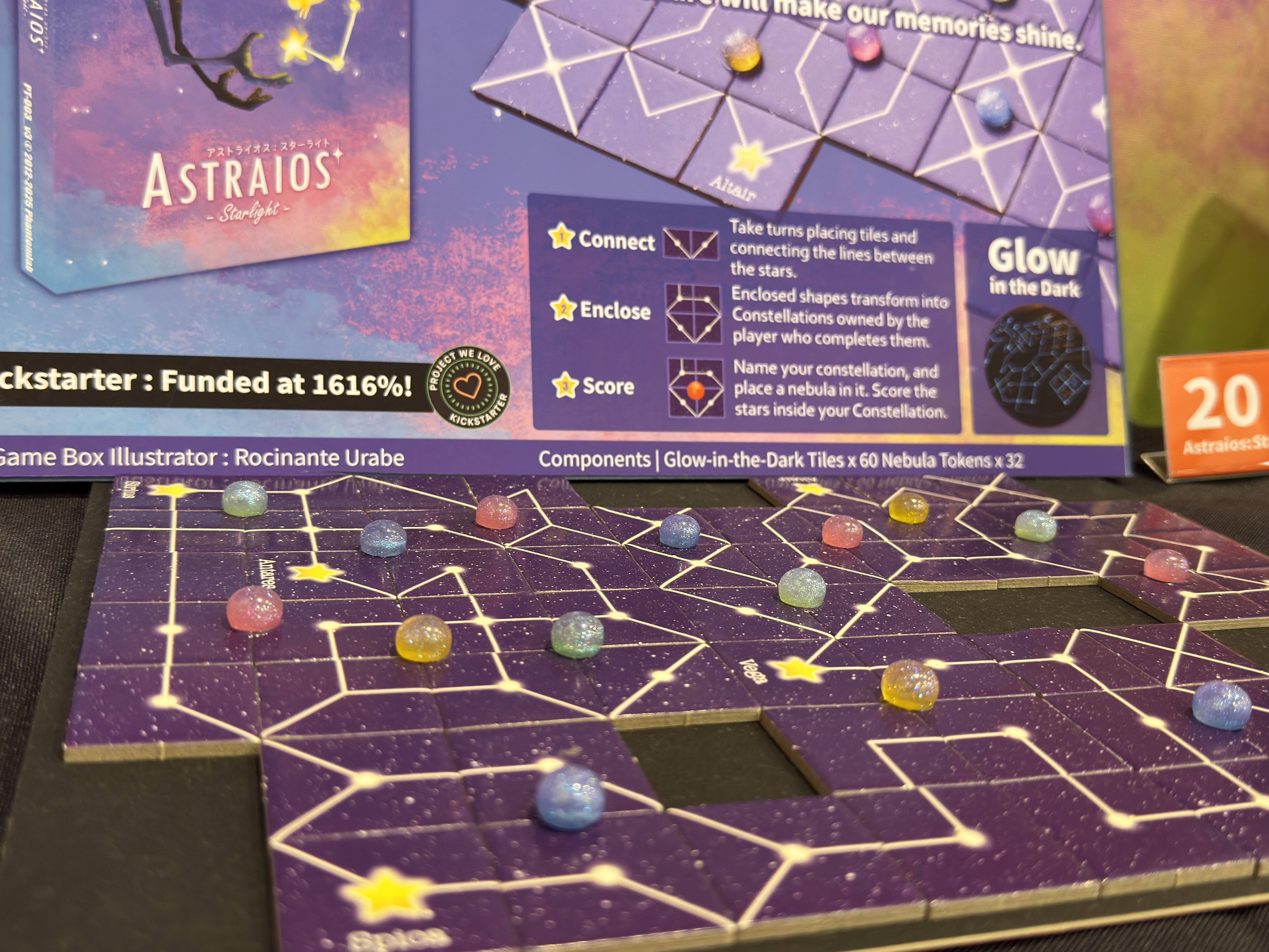 Astraios:Starlight, Kickstarter1616% funded, A tile laying puzzle game to create your own constellations with Glow in the Dark Tiles!
