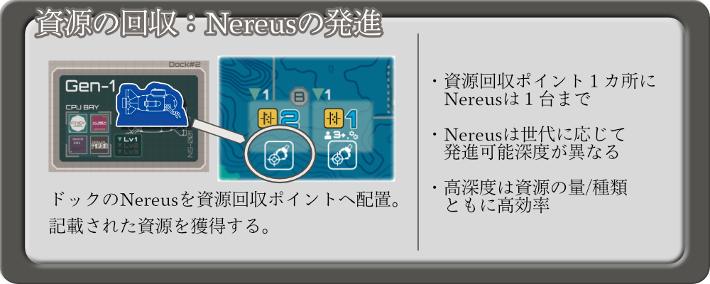 資源回収では、ドックにある Nereus を1機選び、深海へ発進させます。
