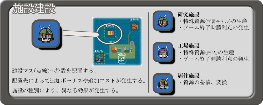 建設できる施設は、研究施設・工場施設・居住施設 の3種類です。