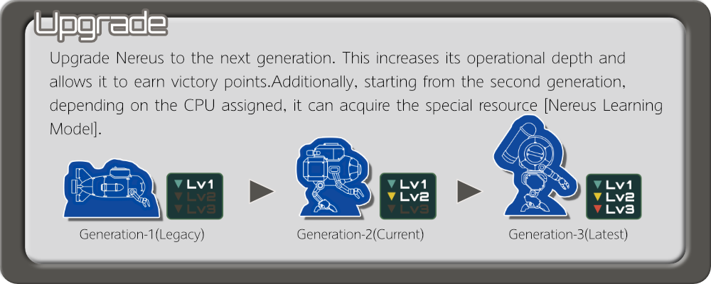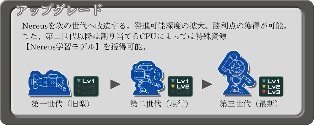 アップグレードではNereusを1機選び、次世代へ改造することができます。