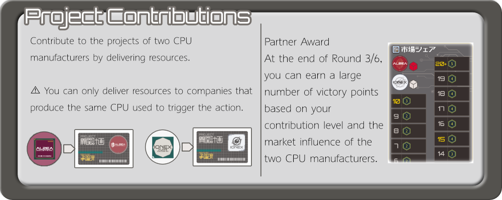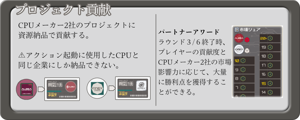 貢献度の高かったプレイヤーは、ゲーム中盤と終了時に行われるパートナーアワードにおいて、貢献先企業の市場影響力と自身の貢献度に基づいて大きな勝利点を得ることができます。