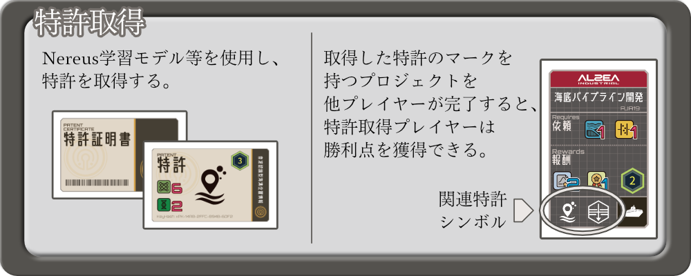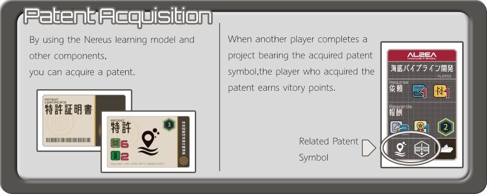 特許に書かれたシンボルを含むプロジェクトを他のプレイヤー が完了したとき、その”特許を持つプレイヤーは追加の勝利点を得る”ことができます。