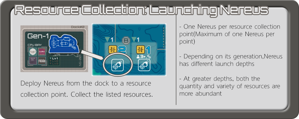 プレイヤーは、第二世代・第三世代のNereus を深海へ発進させることで、特殊資源【Nereus学習モデル】を獲得することができます。