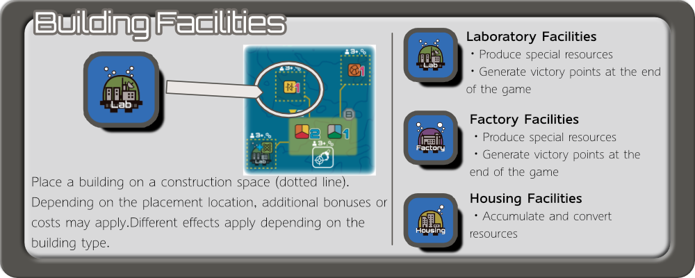 There are three types of facilities you can build: research facilities, industrial facilities, and residential facilities.