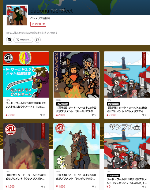 ファンタジーTRPGの金字塔。ソード・ワールド2.5(SW2.5/ソドワ)で遊ぶ人たちによってつくられたサークルです。 オリジナル大陸【クレメリア】を舞台に、ソード・ワールド2.5のワクワクをお届けします! 【お品書き】(記載本の価格はすべて2000円均一です。) ・クレメリアスタートガイド(ゲームマーケット2024秋に頒布したクレメリアシリーズの第一弾!初めてクレメリアを遊ぶ方に!) ・クレメリアテイルズVol.1_イスティアン旅立ちの風(クレメリアのイスティアン地方を舞台にした博物誌風シナリオブック!) ・クレメリアテイルズVol.2_カストナーク鋼の探求心(今度の舞台は砂漠!カストナーク地方を駆ける博物誌風シナリオブック!)