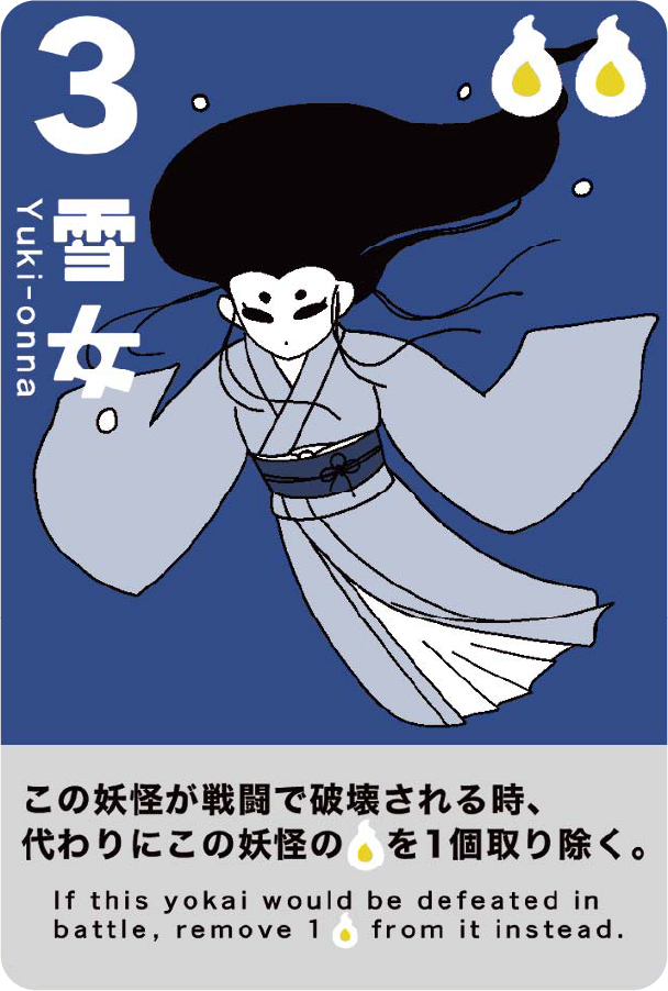 また個人的に強いと思う点は、同じ攻撃力3の妖怪に対して強いことです。相手の場に「攻撃力3の妖怪+ヒトダマ1個」という状況であれば、雪女を召喚しヒトダマを置いて攻撃すれば、一方的に倒すことができます。本来同じ攻撃力同士の戦闘は相打ちですが、雪女はヒトダマを取り除いて生き残ることができます。
