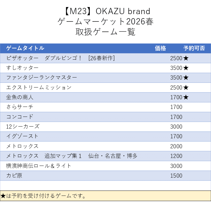 - 【M23】 OKAZU brand ゲームマーケット2026春の取り置き予約開始しました!