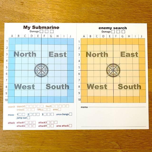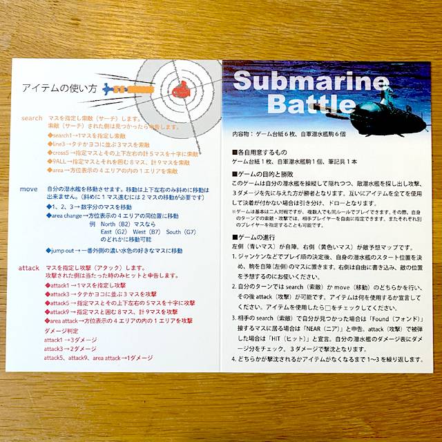 - 互いに自分の台紙上でsearch(索敵)アイテムを駆使し相手の位置を特定。自身の潜水艦はmove(移動)アイテムで動かし相手を翻弄。そして見つけたと思ったらattack(攻撃)アイテムで相手を撃沈。それぞれのアイテムには限りがあり、効果もいろいろです。