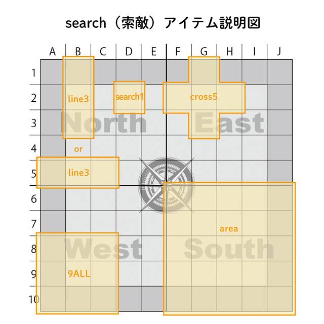 search/マスを指定し索敵(サーチ)します。索敵(サーチ)された側は見つかったら申告します。