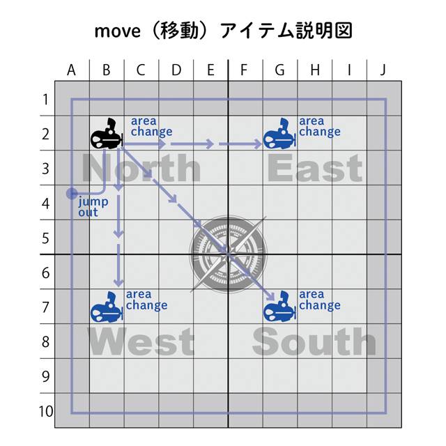 move/自分の潜水艦を移動させます。移動は上下左右のみ斜めに移動は出来ません。(斜めに1マス進むには2マスの移動が必要です)
