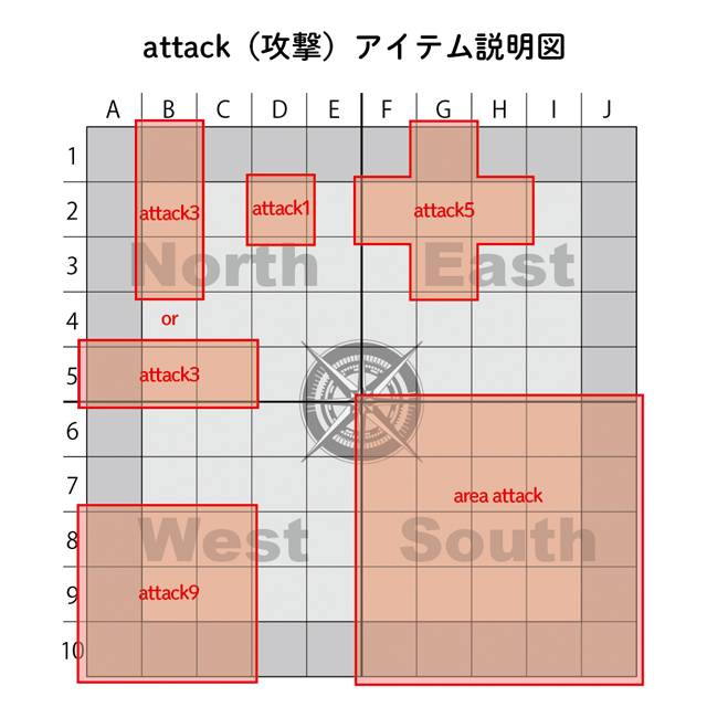 attack/マスを指定し攻撃(アタック)します。攻撃された側は当たった時のみヒットと申告します。