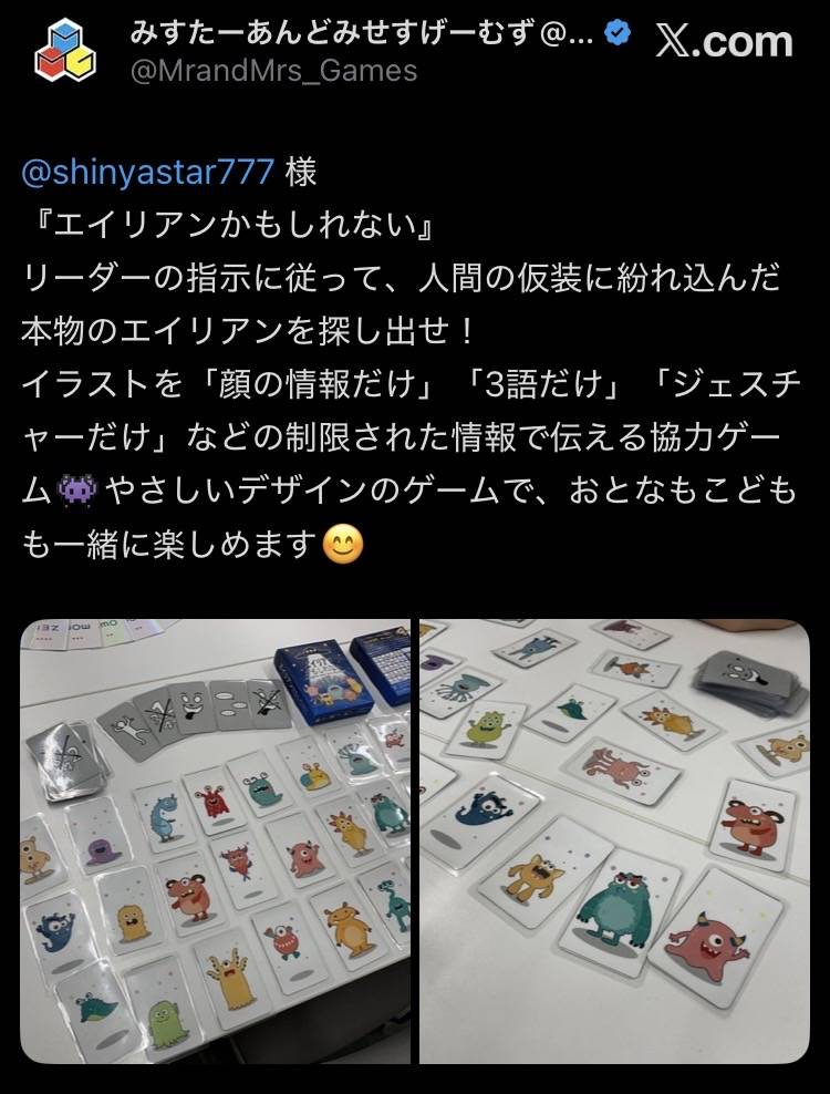 2回まちがえたらゲームオーバー。それまでに取ったカードの枚数によって、ゲームの結末が決まります。皆さんの表現力と想像力を結集させて、悪いエイリアンをどんどん捕まえましょう!