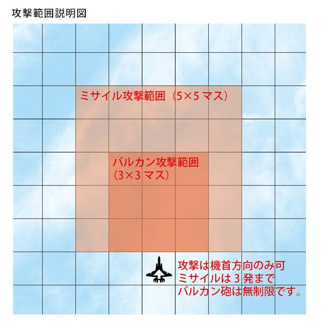 - サイコロでマッハのスピードをコントロールし限りあるミサイルとバルカン砲を駆使してのドッグファイト。サイコロの運を生かすのはパイロットの一瞬の判断です。