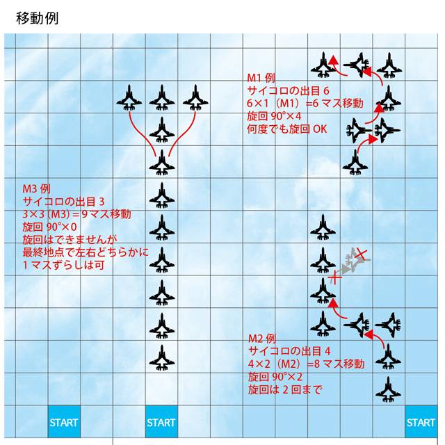 サイコロを振り、出た目とスピードから計算した数だけ移動ルールに従って自機を動かします。移動数は必ず使い切ってください。敵機のいるマスもそのまま進めます。(高度違い設定)ただしフィールド端、行き止まりで旋回も不可能な場合は次ターンの移動方向に機種を向け止まります。