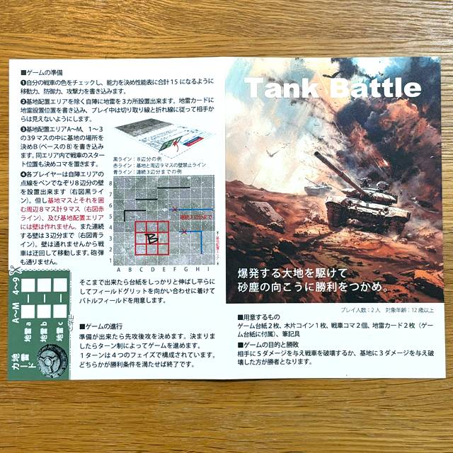 ゲーム台紙2枚、木片コイン1枚、戦車コマ2個、地雷カード2枚(ゲーム台紙に付属)