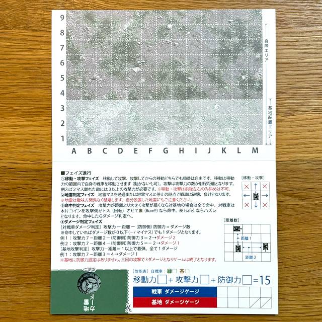 基本はワンセット2枚で二人対戦の戦車戦です。自身の戦車の性能バランスと地雷や壁の設置位置、そして基地の場所、それらをどう配置するか。運を左右するのは小さな軽い木片のコイン。ハガキ二枚分のフィールドはまるで逃れられない戦場のリングとなって戦闘を熱くします。