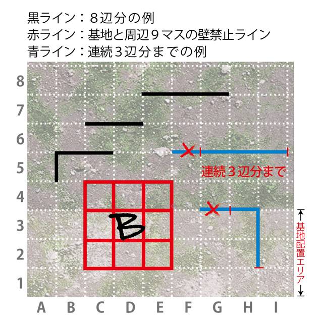 4.各プレイヤーは自陣エリアの点線をペンでなぞり8辺分の壁を設置出来ます。但し基地マスとそれを囲む周辺8マス計9マス、及び基地配置エリアには壁は作れません。また連続する壁は3辺分まで。壁は通れませんから戦車は迂回して移動します。砲弾も通りません。