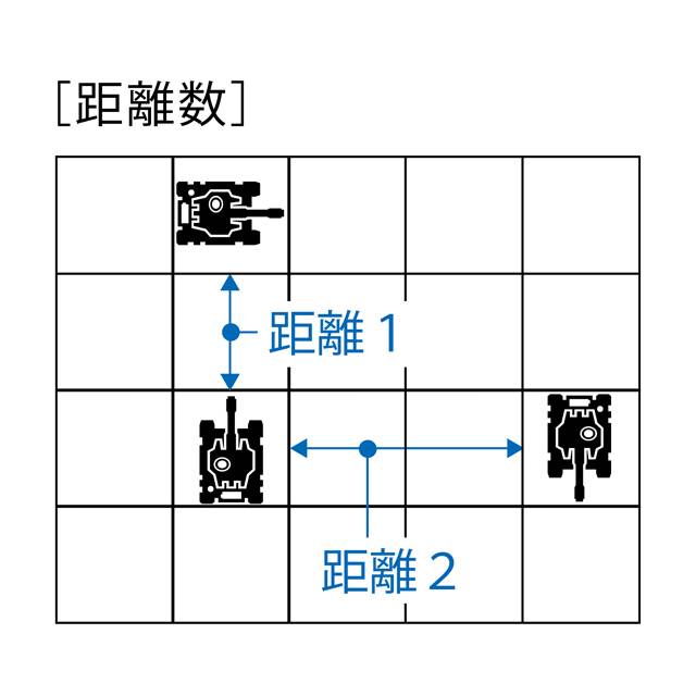 移動して攻撃、攻撃してからの移動どちらでも順番は自由です。移動は移動力の範囲内で自身の戦車を移動させます(動かないも可)。攻撃は攻撃力の数が射程距離となります。例えば2マス離れた敵には3以上の攻撃力が必要です。