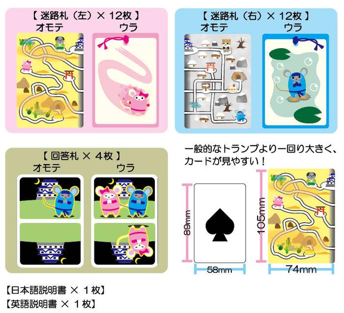 28枚のカードが入っています。カードサイズは、迷路を見やすくするために、一般的なトランプよりも大きいものを採用しました。(A7サイズ)