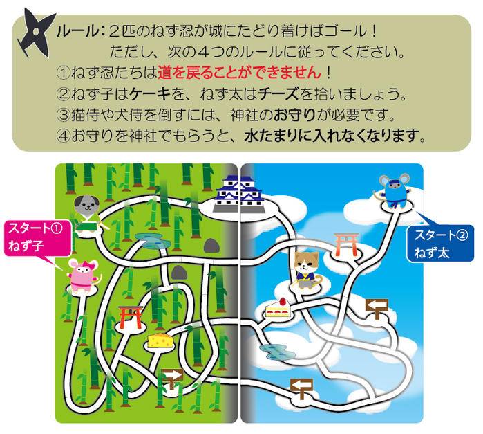迷路は「ねず子」(左)と「ねず太」(右)からスタートし、ゴールのお城を目指します。