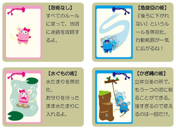 - いかがですか?忍術なしだとゴールできなかったねず子でしたが、いずれの忍術が発動しても攻略できるようになりました。どの道をたどればゴールできるか、分かりますか?上の迷路に戻ってじっくり考えてみてくださいね。
