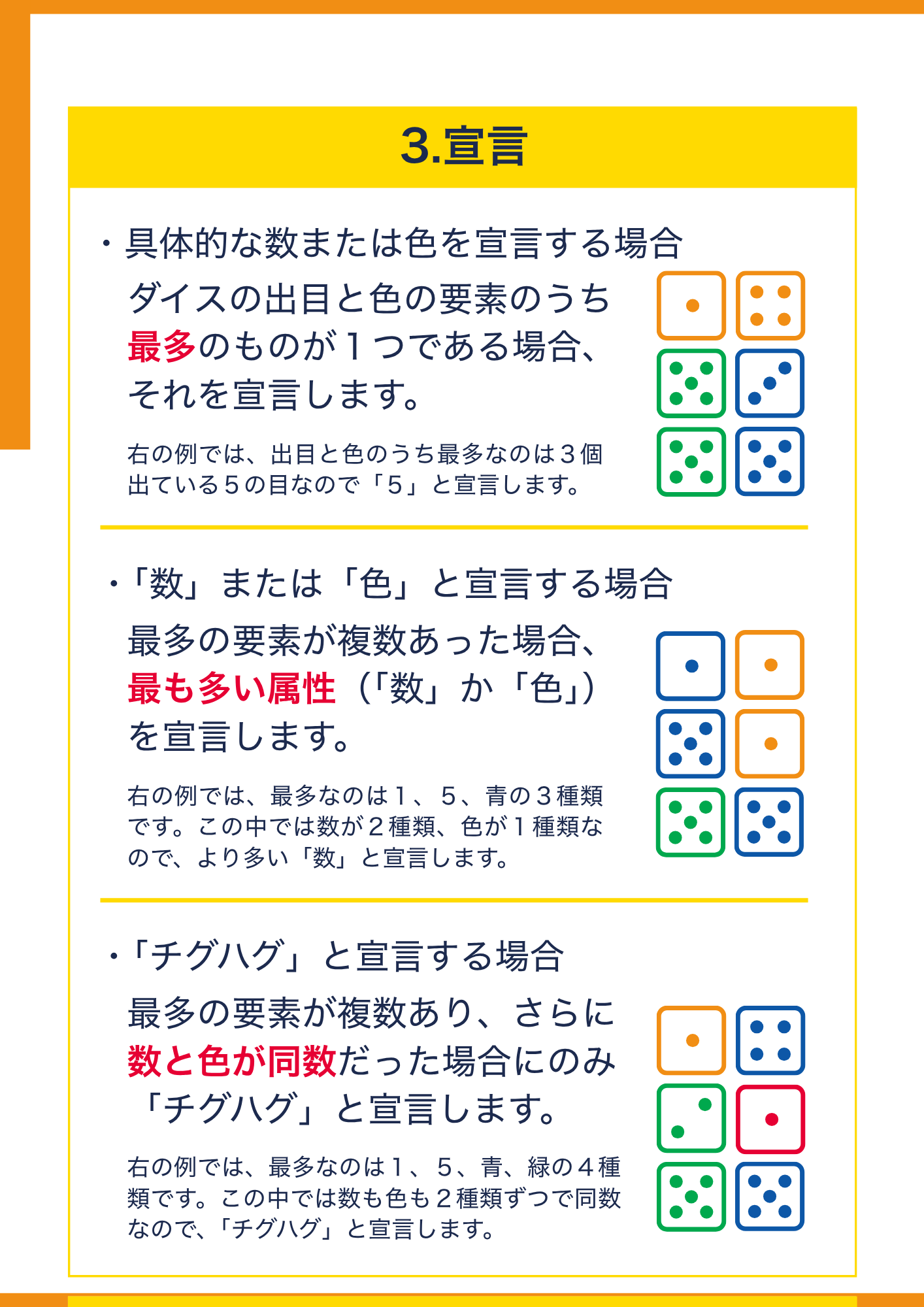 - 最多がタイの場合は「数」または「色」と宣言、それでも同じなら「チグハグ」