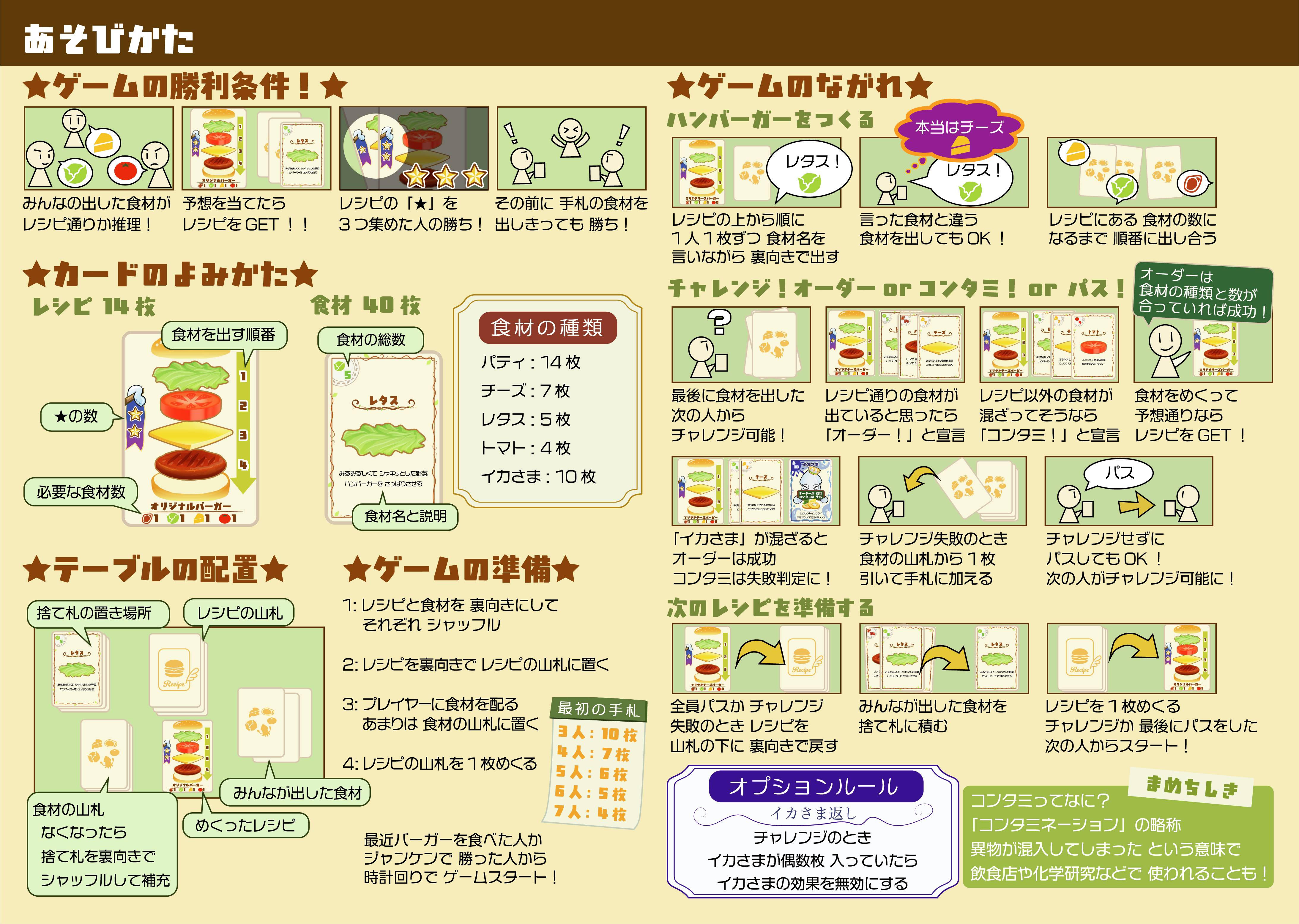 場にハンバーガーのレシピが公開され、順番に裏向きで素材カードを出していき、完成時にレシピ通りに作れているかを当てるブラフゲームです。