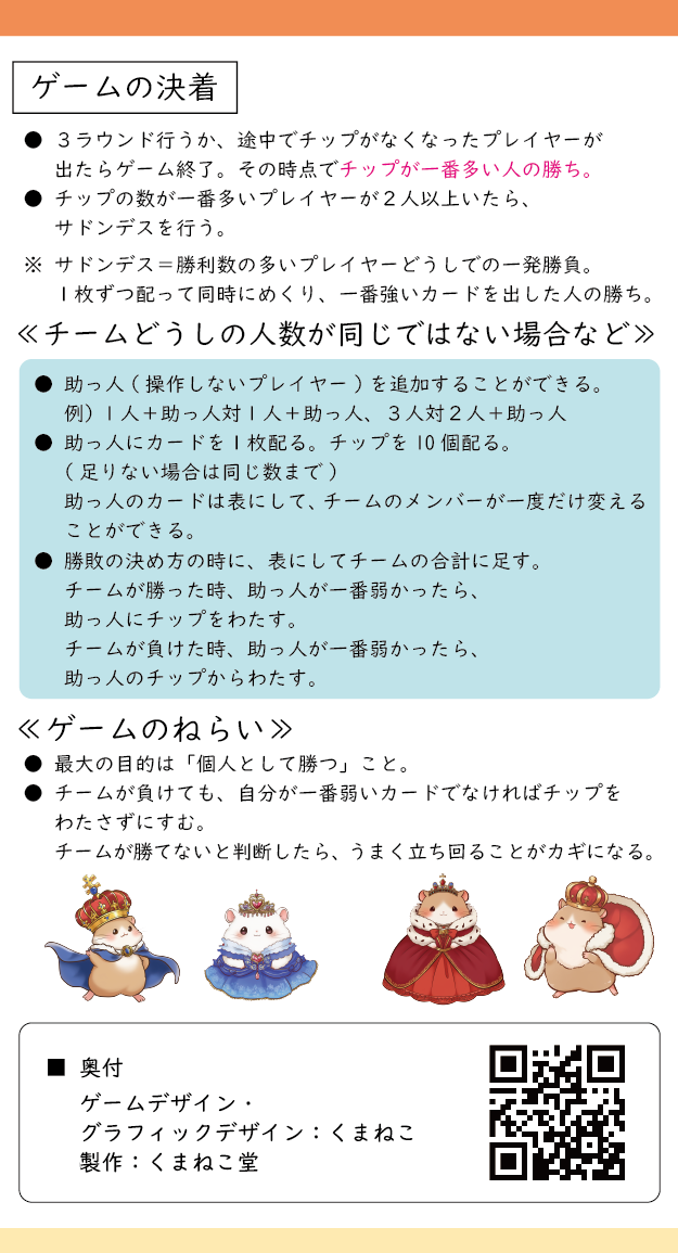通常のインディアン・ポーカーにスペシャルカードを加えたルールや、チップを使ったチキンレース、チーム戦だけどうらぎりありのゲームなど、みんなでわいわい盛り上がれます。