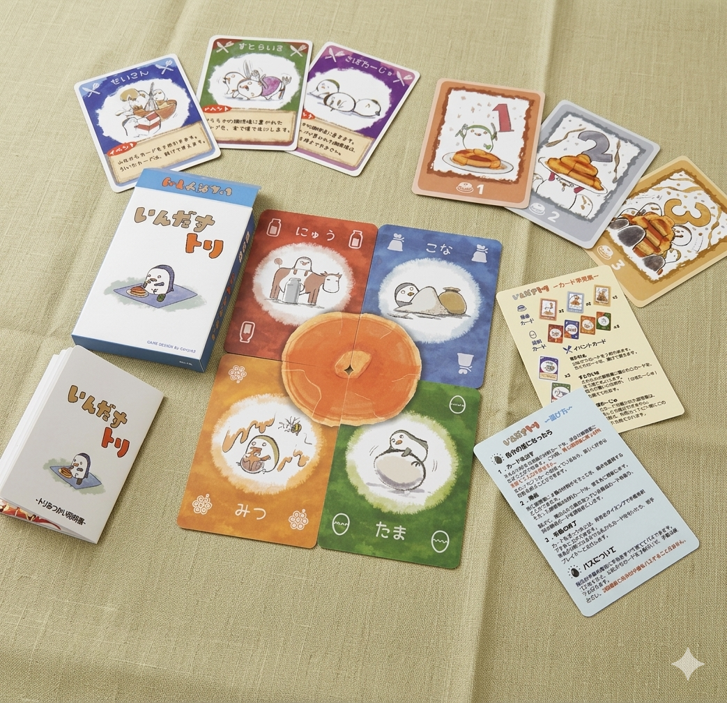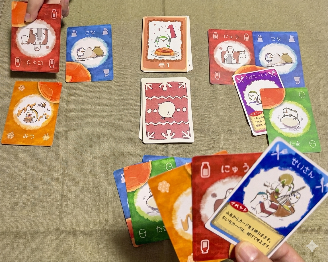 - 4種の材料カードを2つの調理場に出し合い、先にホットケーキを完成させよう! 手札は3枚、何枚使ってもOK! でも出しすぎは相手に横取りされるかも!? 得点は毎回変化、5点先取の読み合いバトルです!