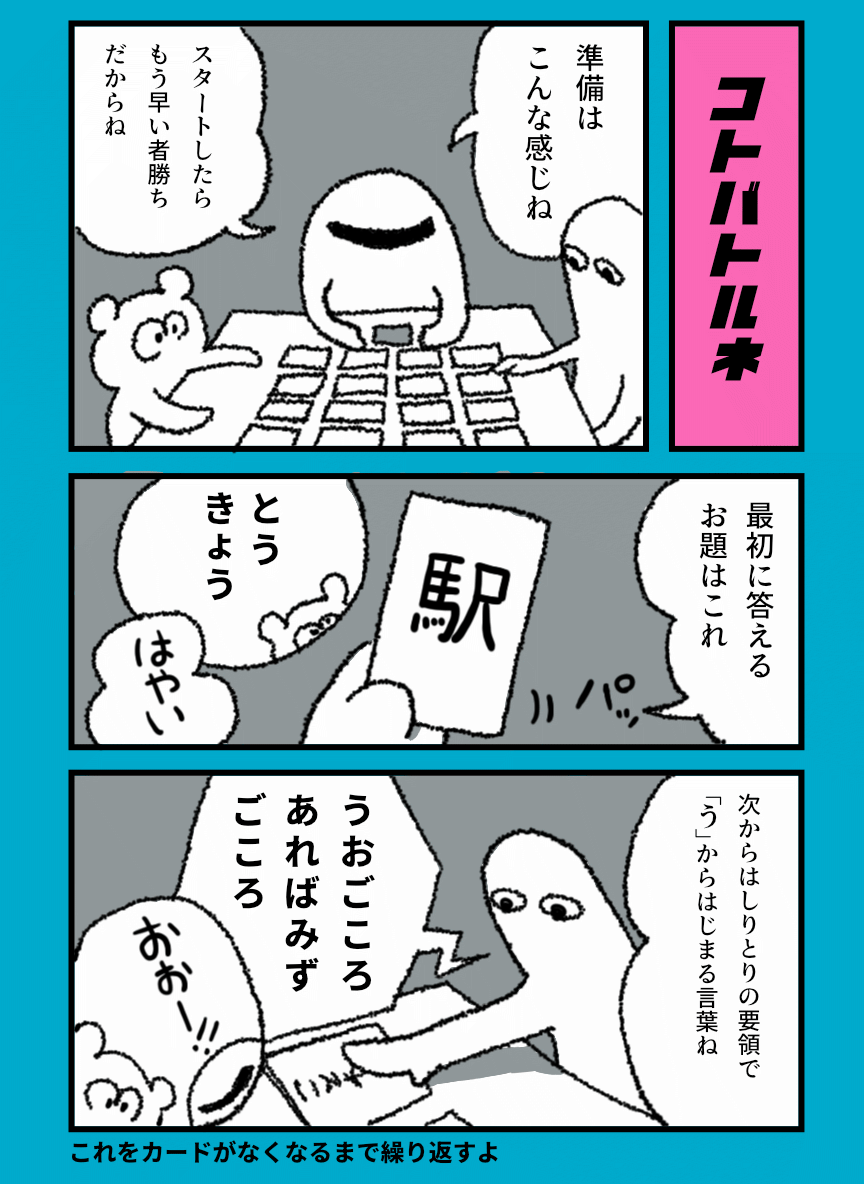 - 場に出たカードを手番なしの早取りで取っていきます。ただし、お題に沿った言葉を言うこと。そしてしりとりになっていること。
