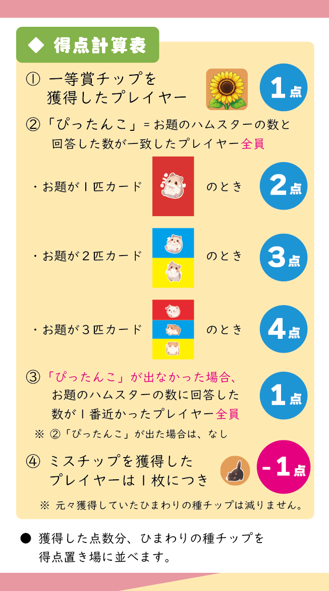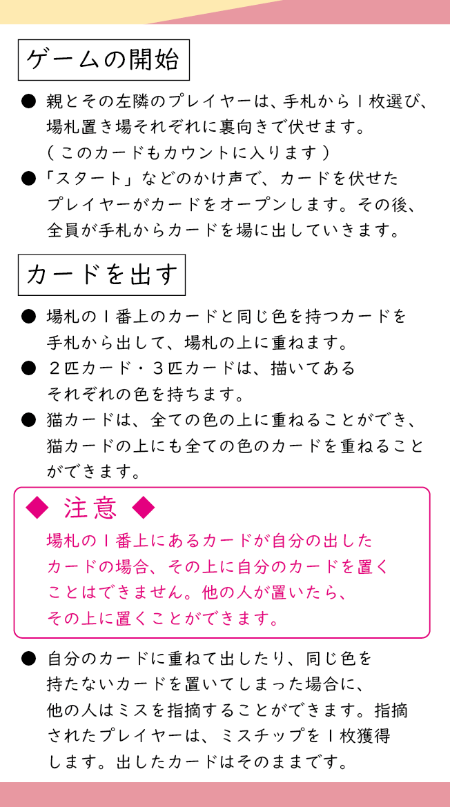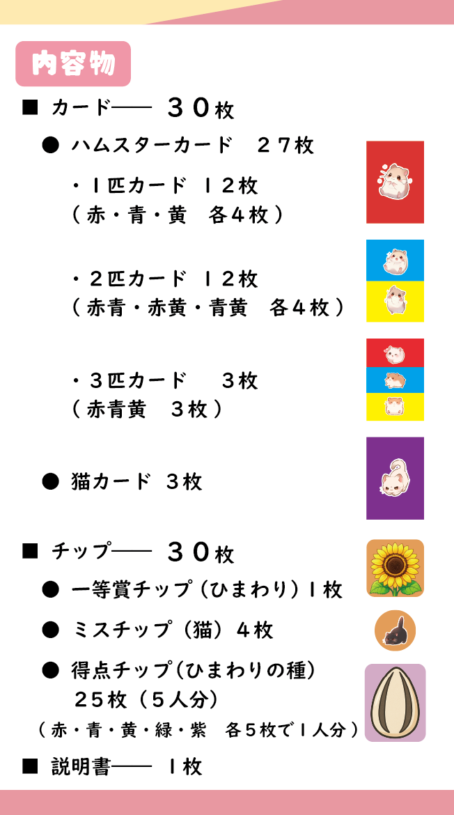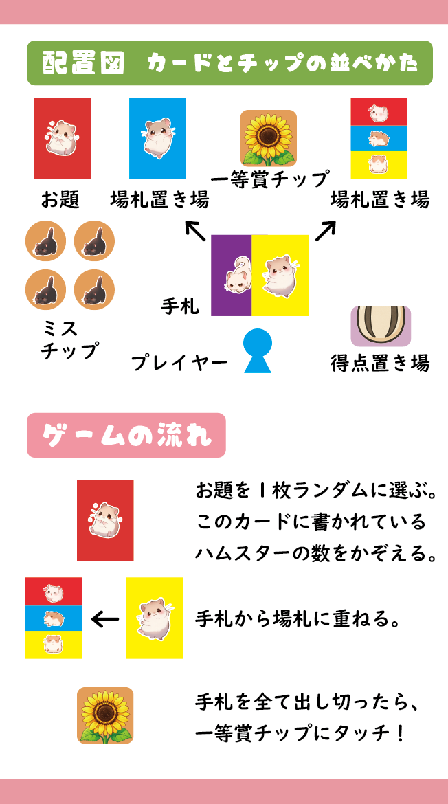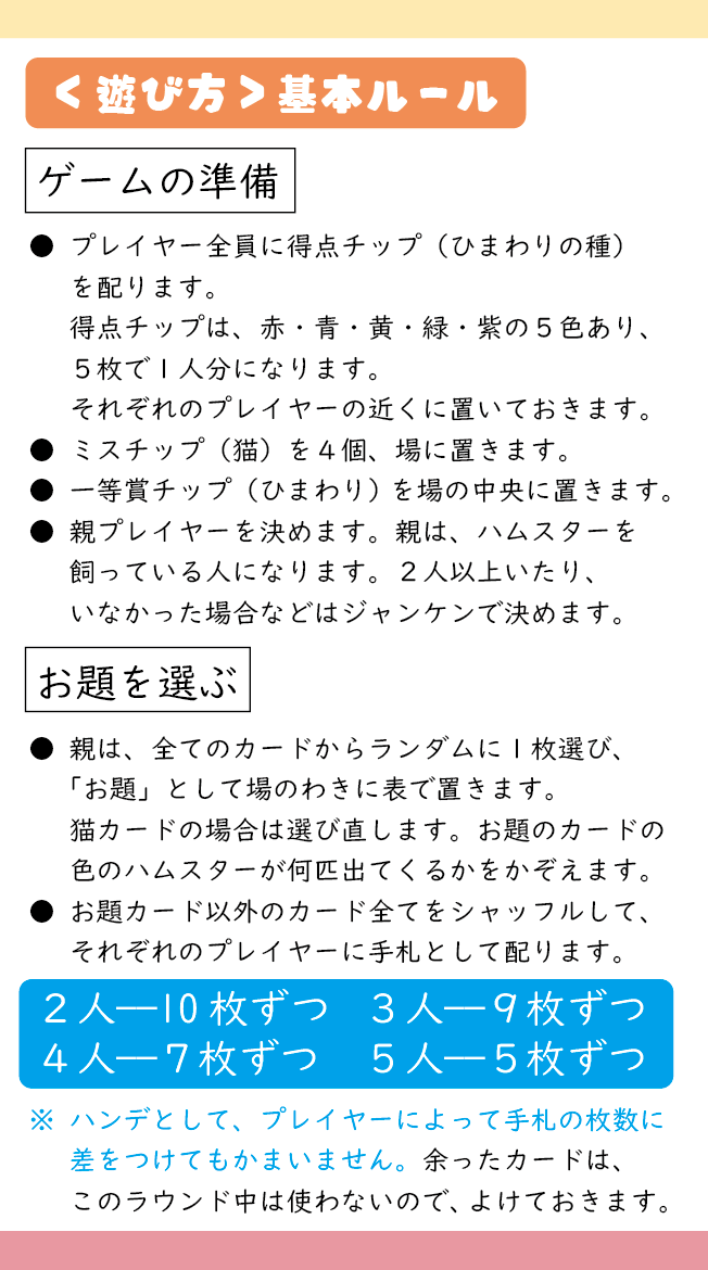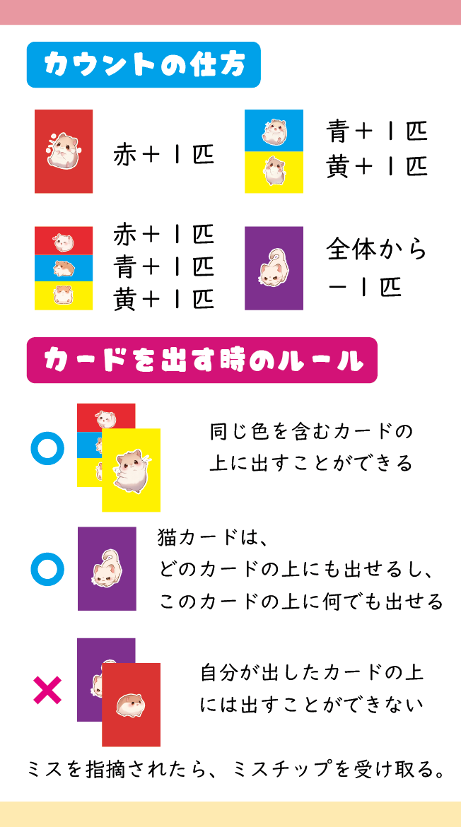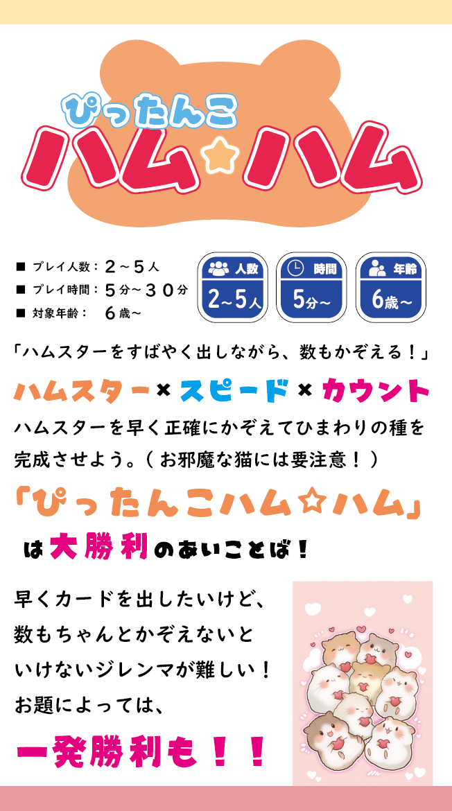 カードを早く出していくスピード系ゲーム! だけど、お題の色のハムスターの数もかぞえなくちゃいけないのが難しい! けど、それがとっても楽しいです!