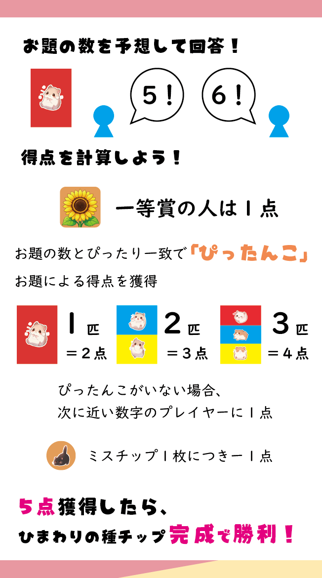 | プレイ人数 | 2〜5人 | プレイ時間 | 5〜30分 |