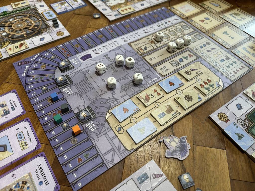 プレイヤーは空飛ぶ船の造船や操縦を行う「空船士(くうせんし)」となり、誰よりも優秀な「空船士」であることを認めさせることを目指します。 振られたダイスを選び、船を進める「飛行アクション」と様々な効果でボードを強化する「開発アクション」を駆使し、タイルの連鎖などをうまく使って一気に加速しましょう。