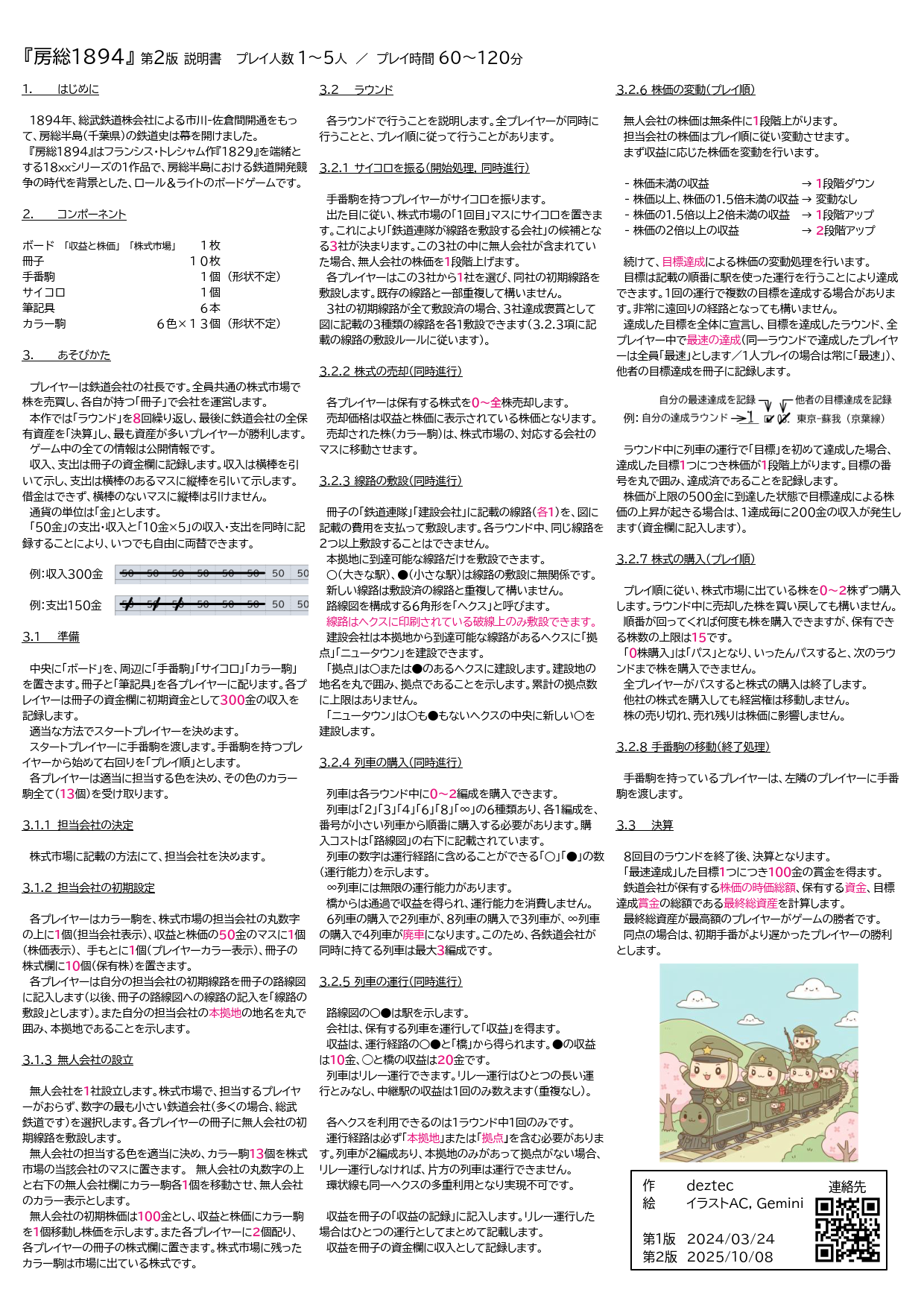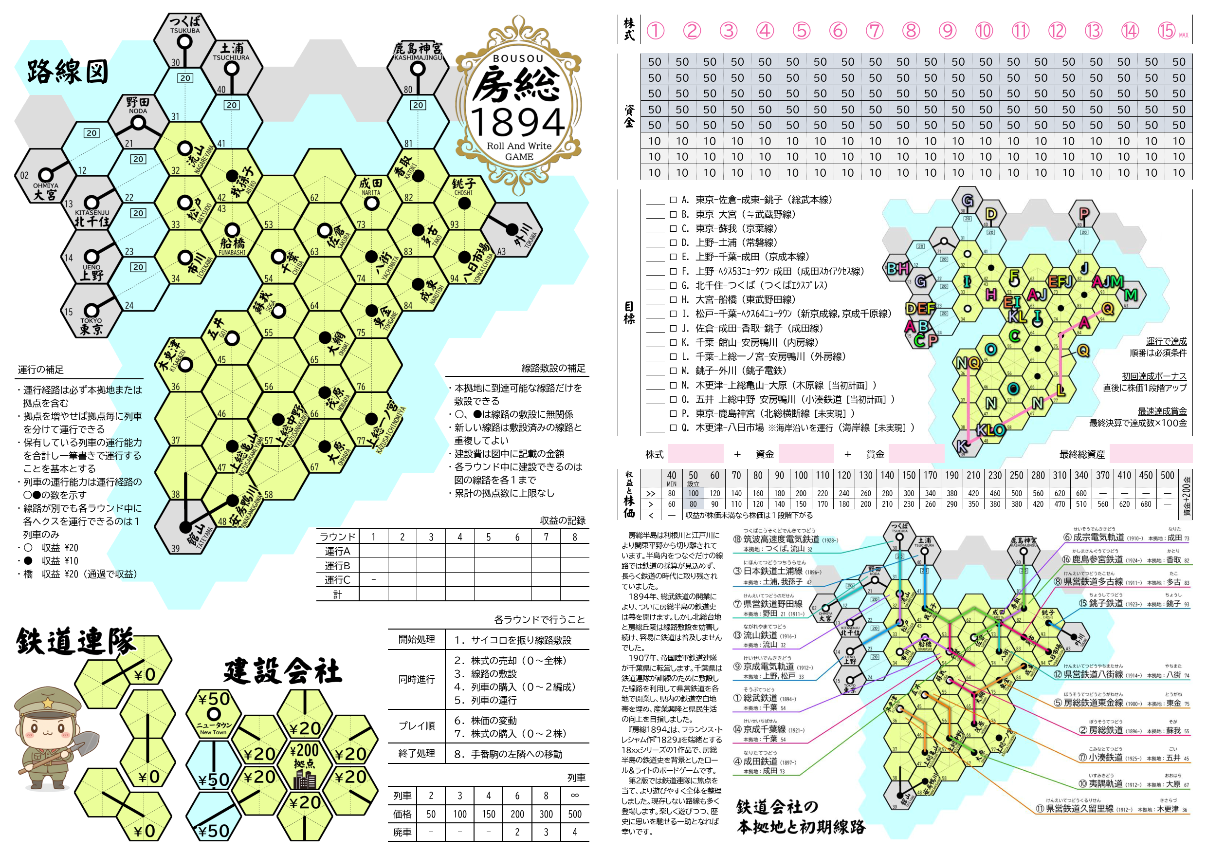 「18xx の要素全部入り」を目指した第1版から1年半経ち、作者自身の心境も変化したことから、ロール&ライトのゲームらしい気楽さ、自由さを求めて全面的に内容を見直しました。