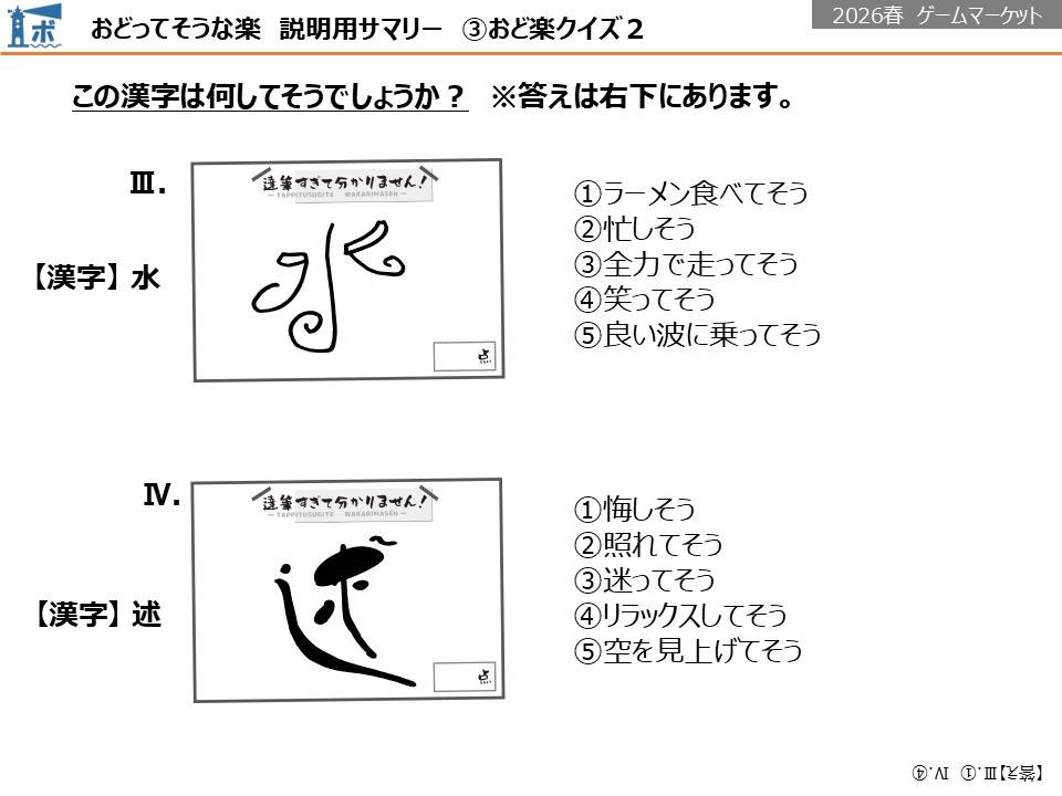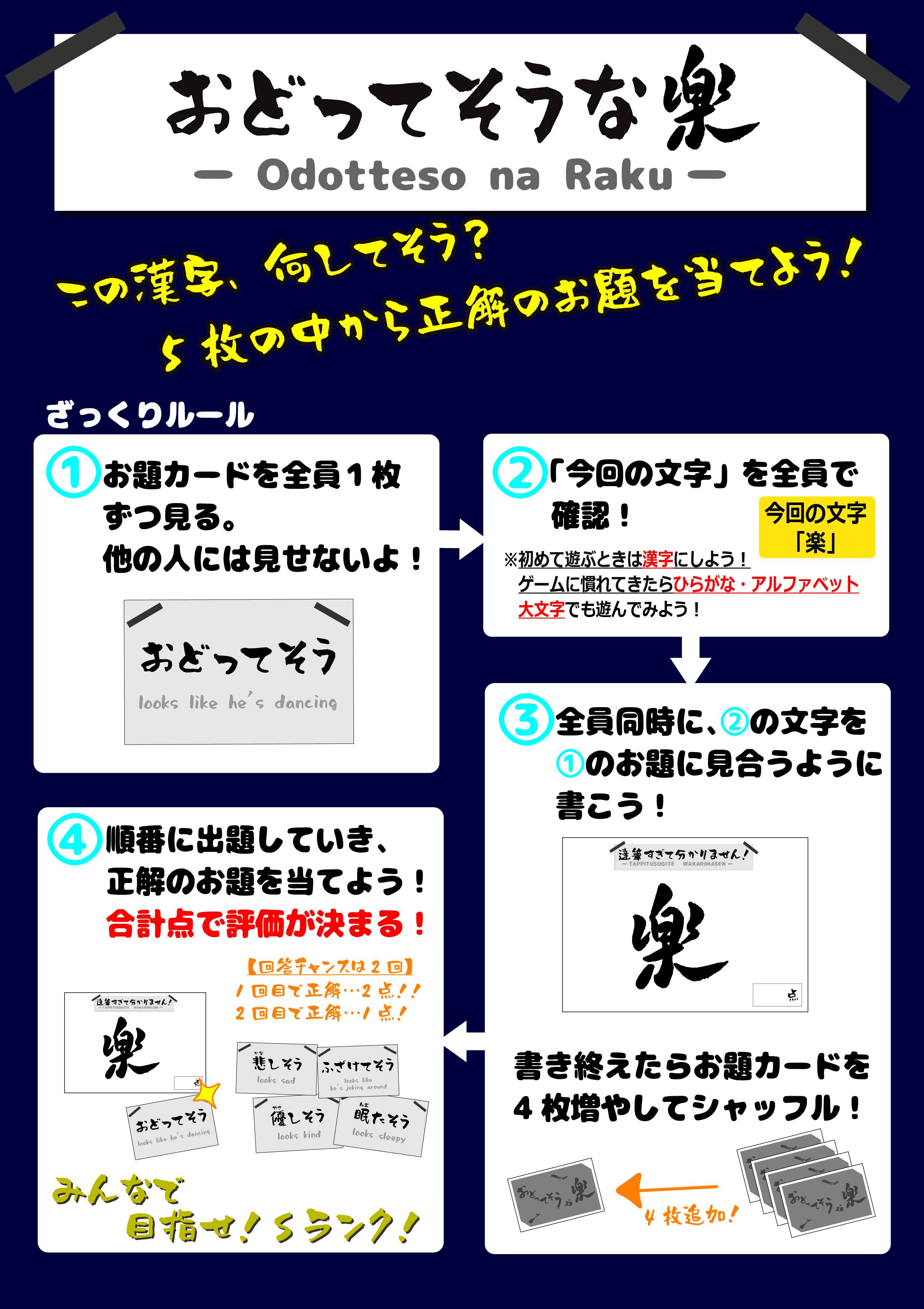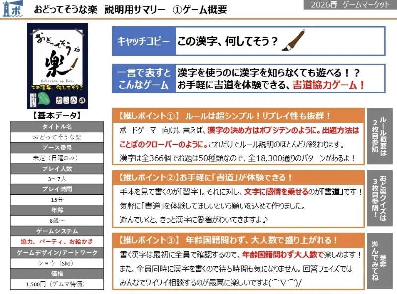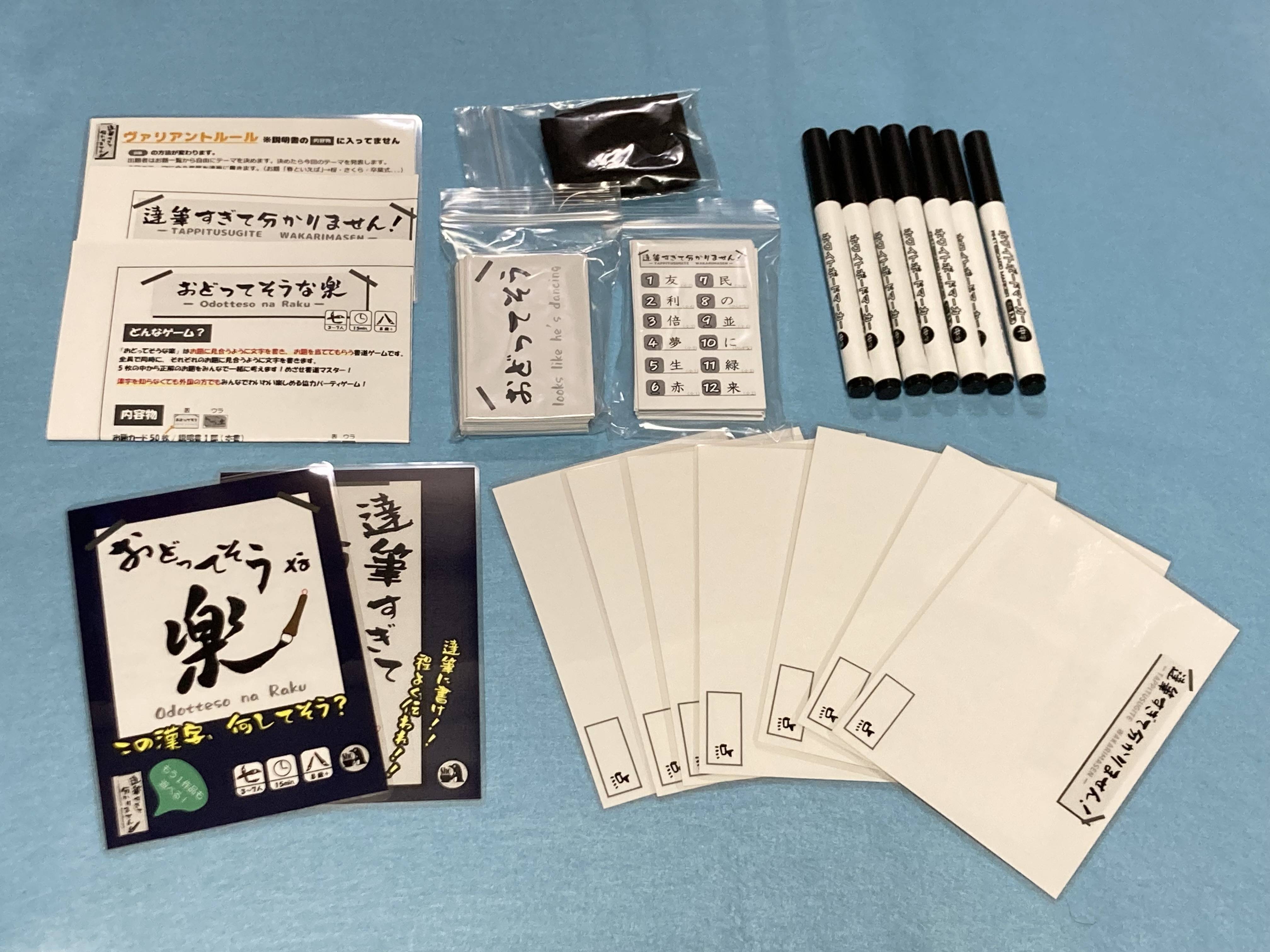 2024秋作品でしばらく完売していた「達筆すぎて分かりません!」も遊べるようになっております!また、すでに達筆をお持ちの方向けにおどってそうな楽単品(イベント価格500円)を販売します。お題カードのみとなります。達筆の袋に一緒に入れられますよ(^▽^)/