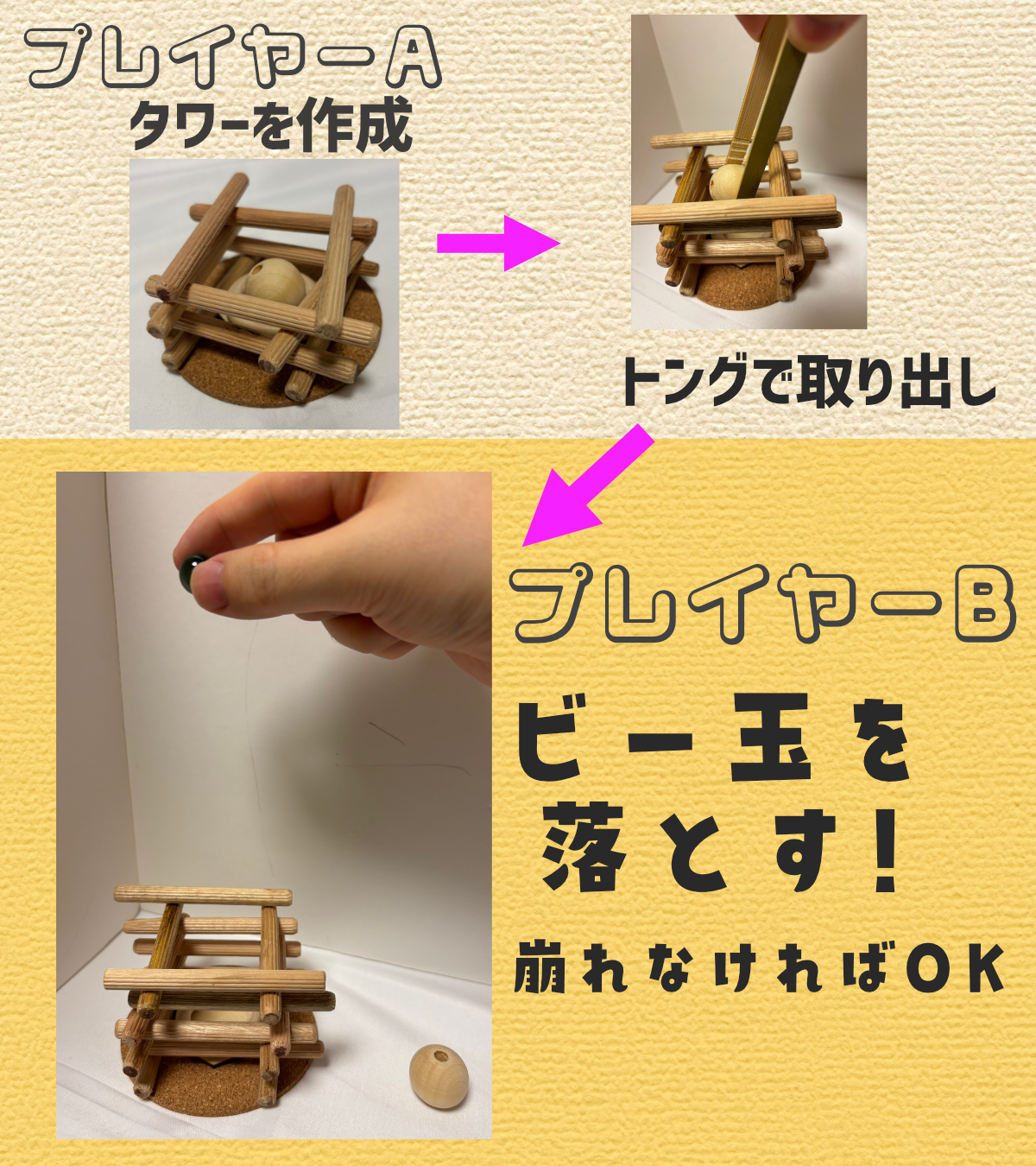 2. チャレンジャープレイヤーはビー玉を落とし、崩れなければ成功
