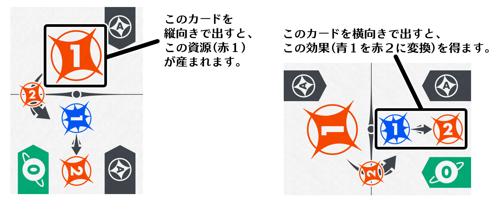 1つ目の使い方は、他のゲーム同様に「縦向きで出して、資源を産む」です。