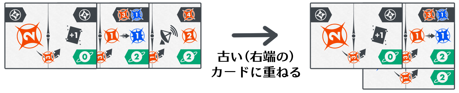 さらに、場札の効果は左 (新しい場札) から右へとコンボするので、場札にする順番も考えないといけません