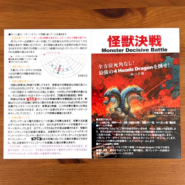 部隊で協力して四つ首龍を倒せ。最強の四つ首龍、四つの首に死角は無い。攻撃は防がれ、熱線に衝撃波が四方へと放たれる。それをかいくぐりガトリングキャノン、レーザーキャノン、それにプラズマ砲と三種の武器を駆使し、四つの首を破壊して倒せ。互いの連携とサイコロの目、そしてプラズマキャノン、自身の判断が運命を分ける。サイコロ運の要素が強いゲームですが、怪獣との闘いは未知なもの。その理不尽さを体感し、楽しんで頂ければと思います。