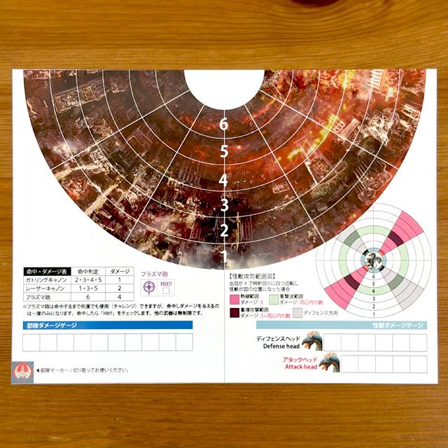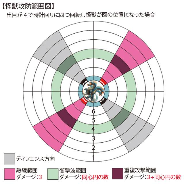 怪獣は衝撃波と熱線で攻撃してきます。衝撃波の攻撃範囲は怪獣回転フェイズの出目の同心円です。そしてその数がダメージとなります。 つまり怪獣が4つ時計回りに回転した場合、4の同心円が攻撃の対象となり、そこに部隊がいれば4ダメージとなります。【怪獣攻防範囲図】参照