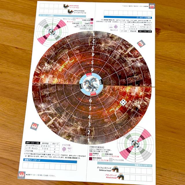 - 攻撃は防がれ、熱線に衝撃波が四方へと放たれる。それをかいくぐりガトリングキャノン、レーザーキャノン、それにプラズマ砲と三種の武器を駆使し、四つの首を破壊して倒せ。互いの連携とサイコロの目、そしてプラズマキャノン、自身の判断が運命を分ける。サイコロ運の要素が強いゲームですが、怪獣との闘いは未知なもの。その理不尽さを体感し、楽しんで頂ければと思います。