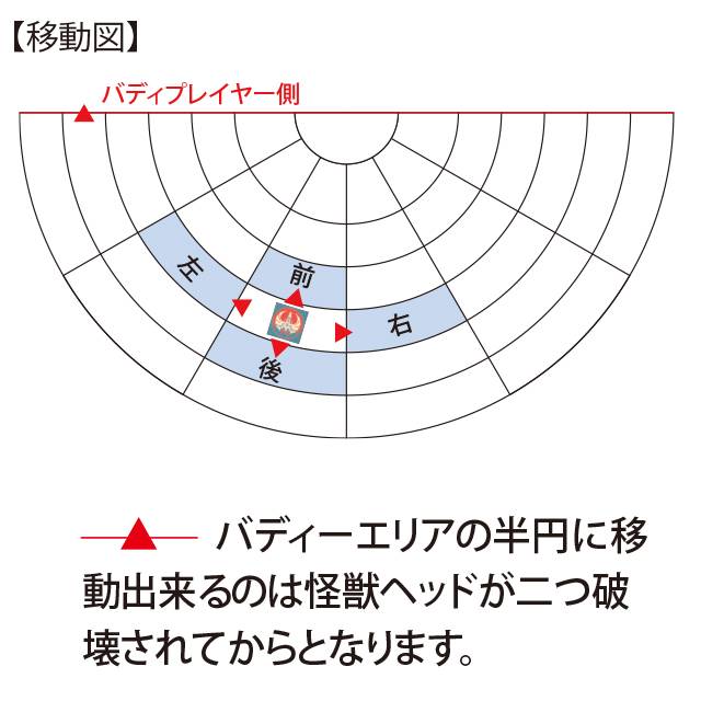 両プレイヤーは部隊マーカーが接している前後左右の同心円マスに1マス移動出来ます(移動しなくても可)。また移動は基本的に自身側の台紙半円内となりますが四つ首のうち怪獣ヘッドが二つ破壊されればバディプレイヤー側の半円にも移動可能となります。【移動図参照】