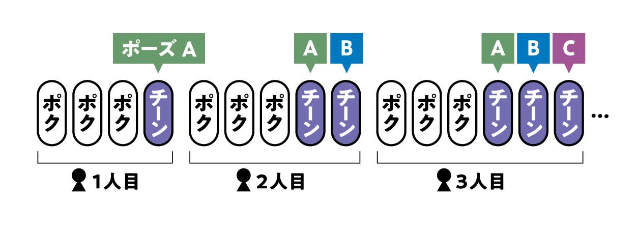 Ⅱ. 『チーン』の音に合わせてイラストに描かれたポーズをとり、次のプレイヤーに代わります。