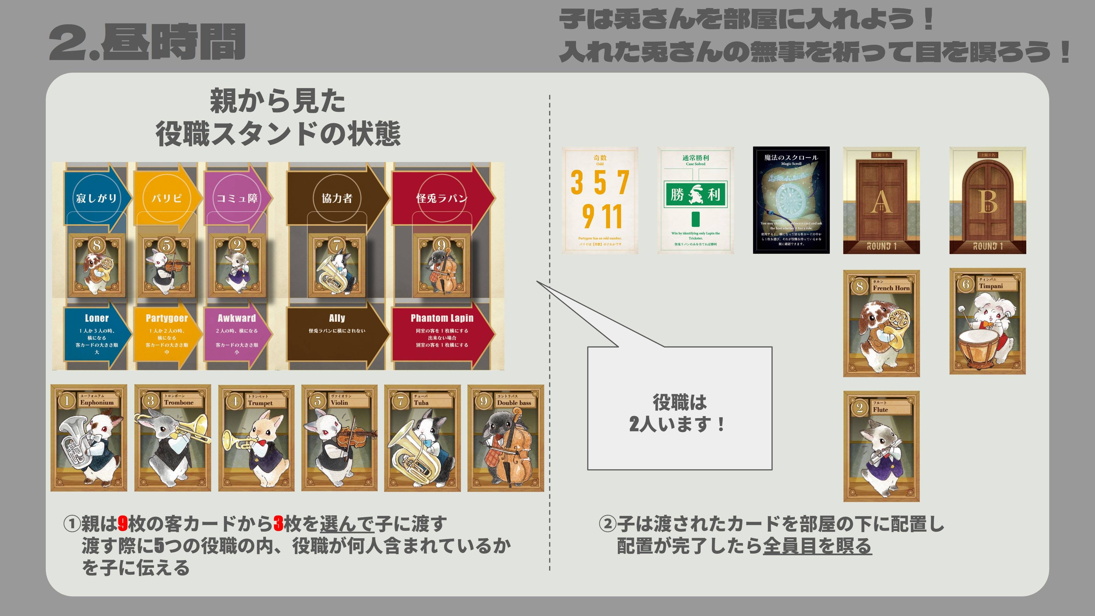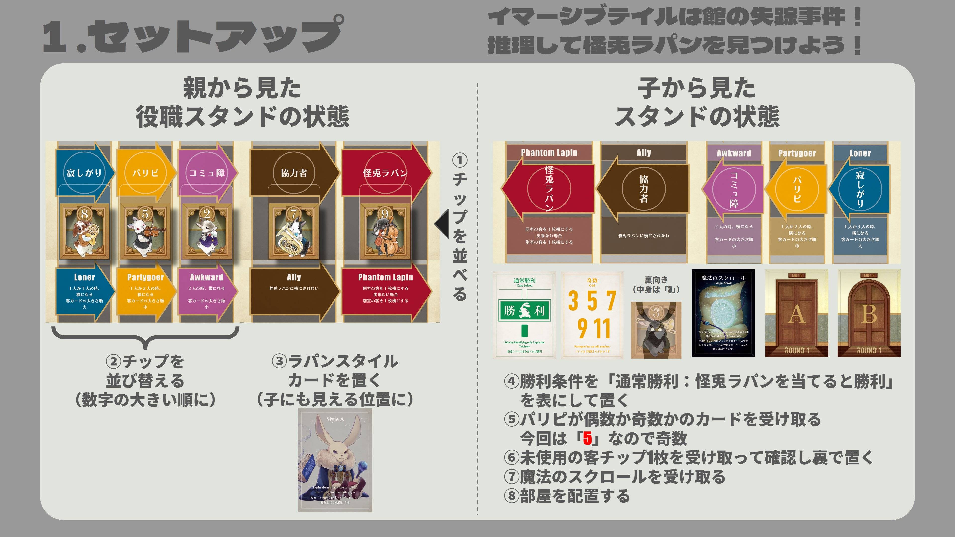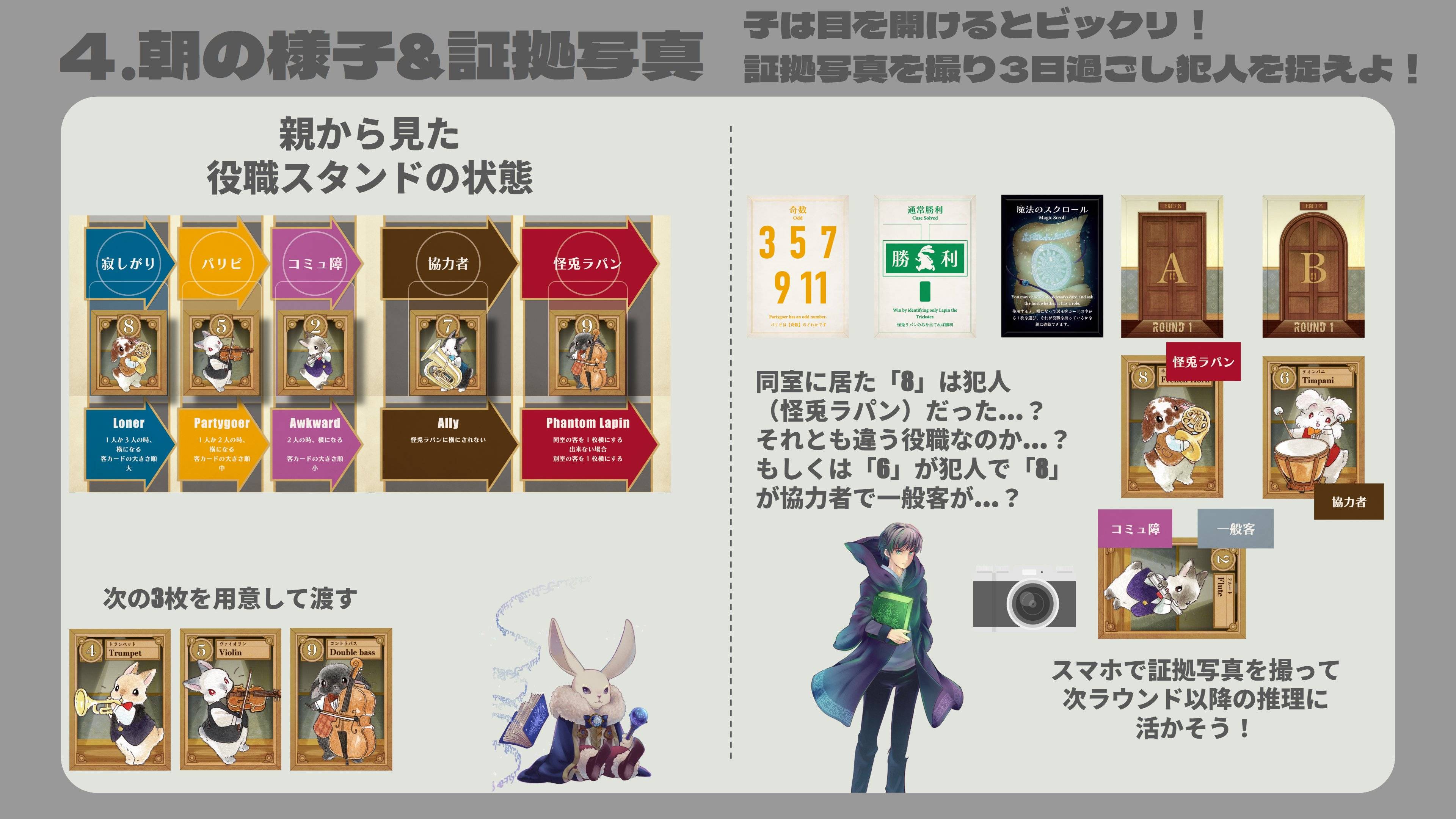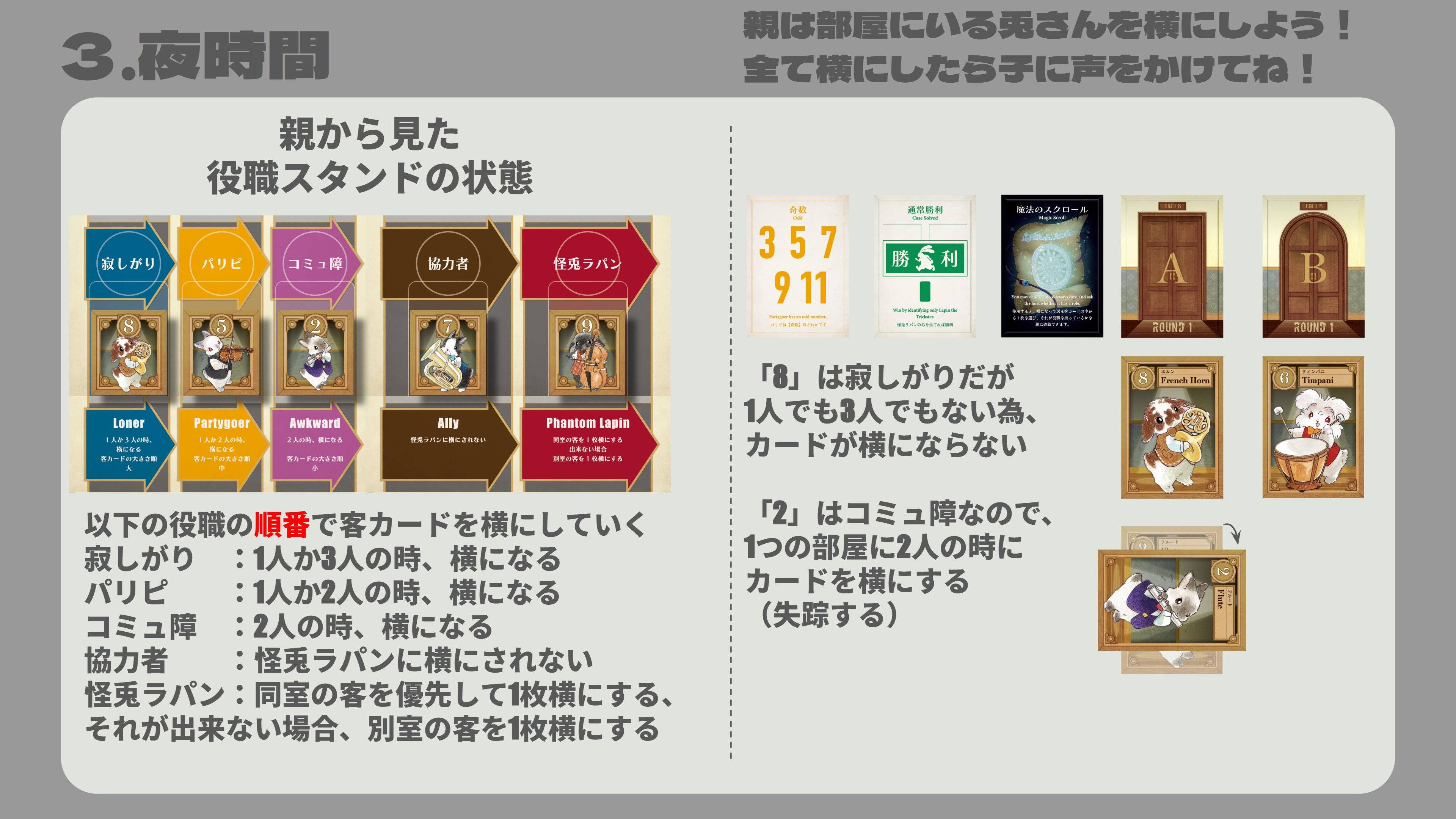 最後に、子は「誰が怪兎ラパンだったか」を最終推理で当てます。役職には「寂しがり」「パリピ」などがあり、 それぞれ消える条件違います。これをヒントに、皆で話し合いながらラパンを推理してください。