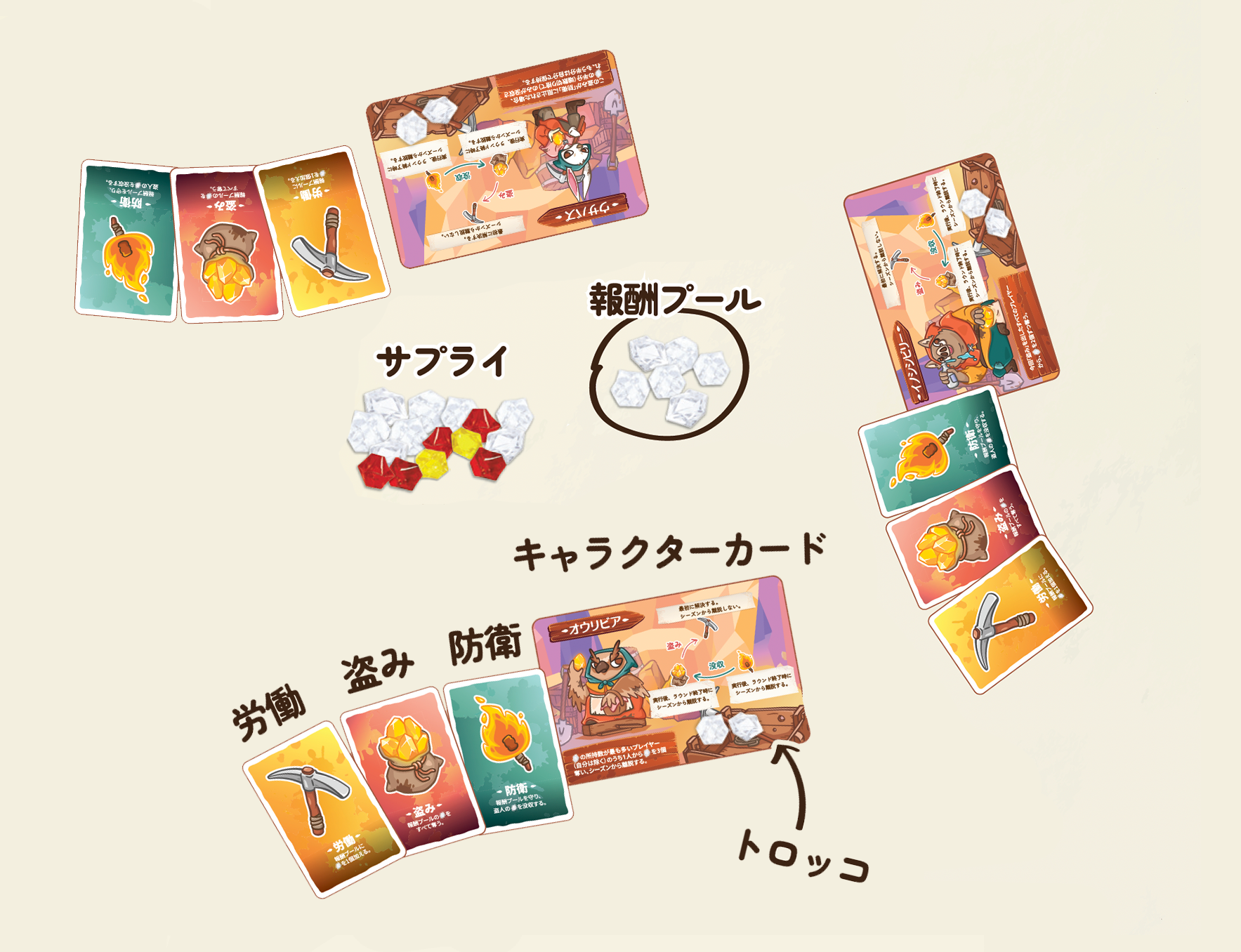 手札となる【労働】【盗み】【防衛】の3つの「アクションカード」を受け取ってゲームを開始します。